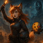 Anime-style digital painting of Kiki, a fox-girl journalist with long orange-red hair, fox ears, and a fluffy tail, standing confidently in a futuristic newsroom filled with floating holographic screens showing video game news. She wears a stylish modern outfit inspired by Game Cookies’ visual identity, lit with warm orange and cool blue tones. The background hints at multiple gaming universes and corporate drama. Space is left on one side for Chip, the floating cookie mascot.